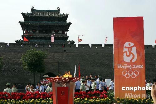 6月25日,奧運(yùn)火炬在山西平遙古城順利傳遞。整個傳遞過程中的唯一一次古城墻之旅,充分展現(xiàn)了平遙深邃的歷史特色。中新社發(fā) 張?jiān)?攝