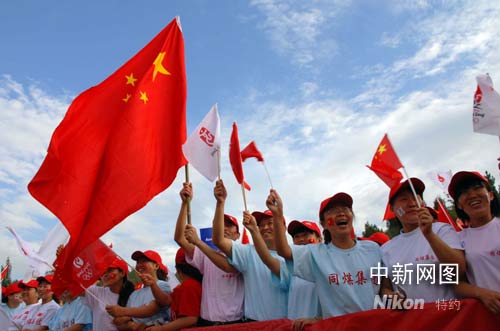雖然大同站的火炬?zhèn)鬟f路線較短,線路周邊左靠河流右依山頭,無法容納太多的群眾,但在傳遞線路兩旁還是有為數(shù)不少的民眾,現(xiàn)場為奧運加油喝彩。張雷杰攝