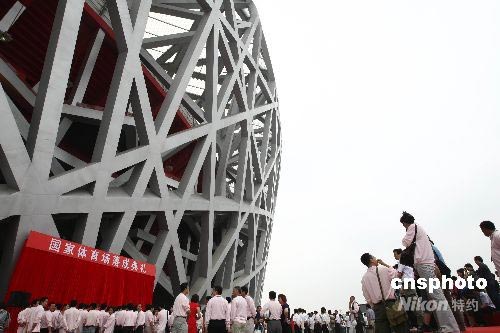 6月28日,國家體育場(“鳥巢”)落成典禮在北京舉行。國家體育場“鳥巢”系第29屆夏季奧運會主體育場,位于奧林匹克公園內(nèi),占地21.4公頃,建筑面積25.8萬平方米,南北長333米,東西寬298米,高68米,賽時坐席9.1萬個,是目前世界上跨度最大的鋼結(jié)構(gòu)體育建筑之一。 中新社發(fā) 盛佳鵬 攝