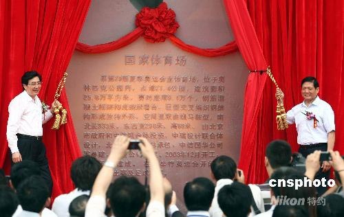 6月28日,2008年北京奧運(yùn)會(huì)主體育場(chǎng)(“鳥巢”)落成典禮在北京舉行,北京市委書記、北京奧組委主席劉淇與北京市委副書記、市長、北京奧組委執(zhí)行主席郭金龍等參加落成典禮儀式。圖為劉淇、郭金龍為國家體育場(chǎng)落成紀(jì)念柱揭幕。中新社發(fā) 盛佳鵬 攝