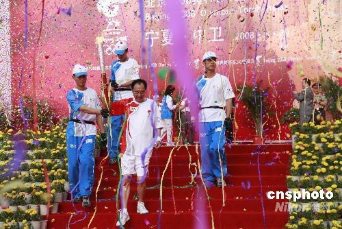 中衛(wèi)市是奧運火炬在寧夏傳遞第一站,火炬手共有205名,第一棒火炬手是寧夏文聯(lián)名譽主席、知名作家張賢亮。張賢亮開辦了鎮(zhèn)北堡西部影視城并成功經(jīng)營,號稱中國作家“首富”。 中新社發(fā) 蘆河 攝