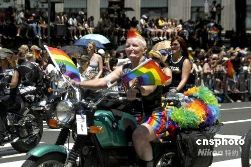 6月29日,同性戀大游行在紐約曼哈頓第五大道舉行。參加者盡情展示奇裝異服以及想象力,勁歌熱舞,希望引起社會(huì)對(duì)同性戀的更多關(guān)注。中新社發(fā) 魏晞 攝