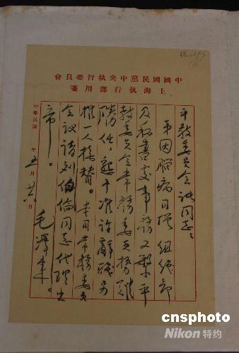這是中國國民黨黨史館館藏的一九二四年毛澤東致平教委員會諸同志的一封親筆信。中新社發(fā) 耿軍 攝