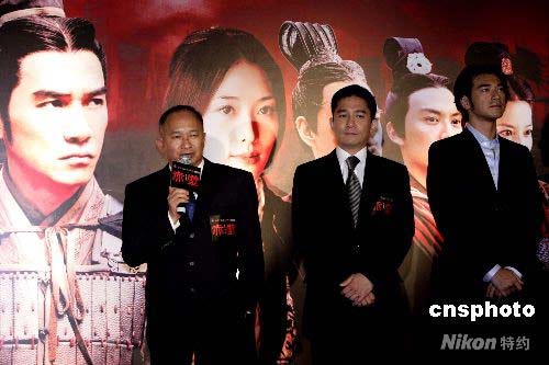 電影《赤壁》在香港舉行慈善首映,劇中主要演梁朝偉、金城武等出席。該片耗資巨大,拍攝過程波折不斷,吳宇森(左)現(xiàn)場介紹拍攝經(jīng)過。中新社發(fā) 王麗南 攝