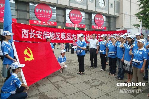 7月1日,中國共產(chǎn)黨成立87周年,黨員志愿者在黨旗下宣誓,將為北京奧運會的成功舉辦奉獻自己的力量。中新社發(fā) 富田 攝