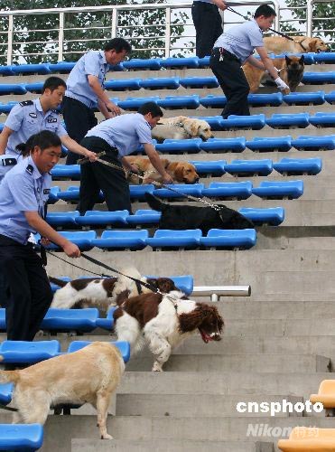 圖為警犬在觀眾看臺進行模擬搜爆演練。 中新社發(fā) 富田 攝