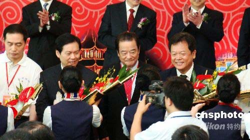 7月4日早晨七點(diǎn),兩岸周末包機(jī)南京首航暨大陸居民赴臺(tái)旅游首發(fā)儀式在南京祿口國際機(jī)場(chǎng)隆重舉行。圖為空乘人員向乘客代表等獻(xiàn)花。中新社發(fā) 丁梅 攝
