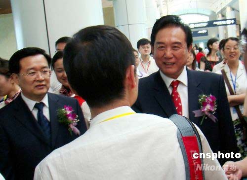 圖為海協(xié)會會長陳云林歡送赴臺旅游的大陸居民。中新社發(fā) 丁梅 攝