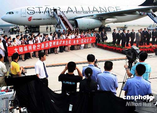 7月4日上午8時(shí)30分,中國大陸第一批赴臺(tái)灣游客,從北京首都機(jī)場(chǎng)乘中國國際航空公司CA185航班起飛,預(yù)計(jì)13點(diǎn)到達(dá)臺(tái)北機(jī)場(chǎng)。國務(wù)院臺(tái)辦、國家旅游局、北京市政府有關(guān)官員到機(jī)場(chǎng)歡送旅游團(tuán)。今天,兩岸將共有11家航空公司的18班包機(jī)往返兩岸。大陸的國航、東航、南航、海航、上航和廈航等6家航空公司,將分別由北京、上海(浦東)、廣州、廈門和南京5個(gè)首批開放航點(diǎn)往返臺(tái)北桃園和松山兩個(gè)機(jī)場(chǎng);臺(tái)灣的華航、華信、長榮、立榮和復(fù)興航空公司則分別由臺(tái)北、臺(tái)中、高雄、花蓮、澎湖飛往北京、上海、廣州、廈門。據(jù)悉,搭乘4日首航兩岸周末包機(jī)的大陸居民赴臺(tái)旅游首發(fā)團(tuán)共有約760名團(tuán)員,由海峽兩岸旅游交流協(xié)會(huì)會(huì)長邵琪偉擔(dān)任團(tuán)長。中新社發(fā) 宋吉河 攝