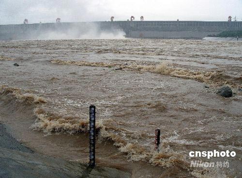 2008年7月5日,大雨中的三峽大壩開啟6個深孔泄洪,每秒下泄流量11000立方米,這是三峽工程2008年首次開閘泄洪。連日來,長江三峽庫區(qū)持續(xù)大到暴雨,長江上游來水猛漲,7月5日10時三峽入庫流量達(dá)34500立方米/秒,三峽壩前水位為145.79米。據(jù)長江防汛抗旱總指揮部披露,預(yù)計(jì)未來幾天長江上游仍將持續(xù)降雨,三峽入庫流量將持續(xù)超過26000立方米/秒,三峽大壩將保持持續(xù)泄洪狀態(tài)。中新社發(fā) 劉君鳳 攝