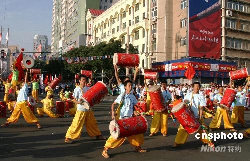 圖:蘭州威風(fēng)鑼鼓為奧運火炬?zhèn)鬟f助威