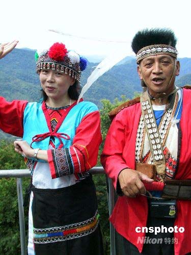 圖中左為身著鄒族傳統(tǒng)服飾的大陸游客,右為當(dāng)?shù)剜u族人士。中新社發(fā) 徐長安 攝