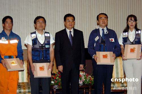 胡錦濤在札幌向日本國(guó)際救援隊(duì)醫(yī)療隊(duì)贈(zèng)送禮品
