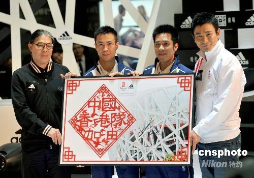 七月八日,香港體育協(xié)會(huì)暨奧委會(huì)會(huì)長霍震霆、香港“乒乓孖寶”李靜、高禮澤及劉德華在香港時(shí)代廣場出席adidas“專為北京打造”奧運(yùn)產(chǎn)品展覽開幕儀式,歌影紅星劉德華致送一幅寫上“中國、香港隊(duì)加油”的剪紙予李靜、高禮澤,以展示港人對中國及香港奧運(yùn)代表隊(duì)的支持。中新社發(fā) 鄧慶樂 攝