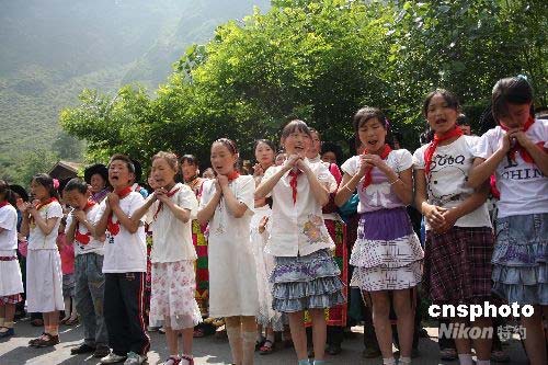 圖為災區(qū)孩子高唱感恩的心來感謝支援他們的好心人。中新社發(fā) 黃榮 攝