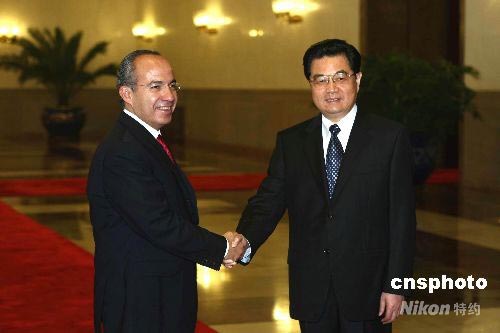 7月11日,中國(guó)國(guó)家主席胡錦濤在北京人民大會(huì)堂與墨西哥總統(tǒng)卡爾德龍舉行會(huì)談。中新社發(fā) 盛佳鵬 攝