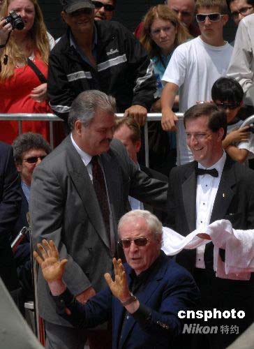 當?shù)貢r間七月十一日,英國影壇老牌影星邁克爾·凱恩(Michael Caine)在著名的好萊塢中國劇院門前留下手印和腳印。邁克爾·凱恩一九六三年因出演《祖魯》而一舉成名,曾兩獲奧斯卡最佳男配角獎。凱恩主演的動作喜劇《意大利工作》被公認為英國電影的經典作品。邁克爾·凱恩出演的好萊塢新片《黑暗騎士》(DARK KNIGHT)即將在北美上映。中新社發(fā) 張煒 攝