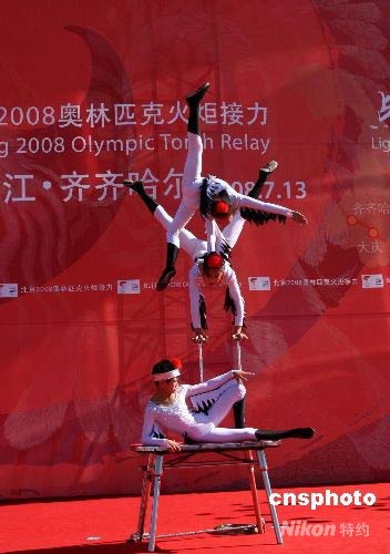 7月13日,北京奧運(yùn)火炬在“丹頂鶴之鄉(xiāng)”齊齊哈爾傳遞,當(dāng)?shù)匦‰s技演員打扮成仙鶴模樣,亮出絕技迎接奧運(yùn)火炬。 中新社發(fā) 周兆軍 攝