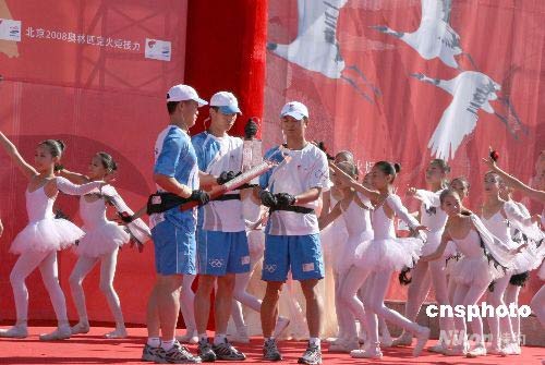 7月13日,北京奧運(yùn)火炬在“丹頂鶴之鄉(xiāng)”齊齊哈爾傳遞。當(dāng)圣火護(hù)衛(wèi)隊(duì)員點(diǎn)燃火炬時,當(dāng)?shù)匦∨笥寻缱饕蝗合生Q在火炬周圍翩翩起舞。 中新社發(fā) 周兆軍 攝