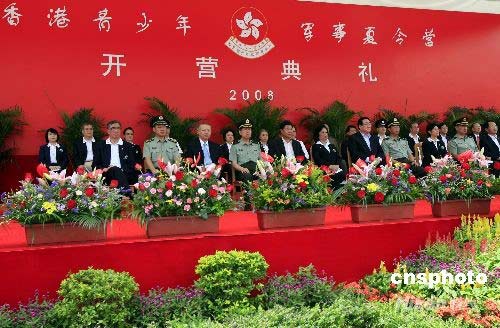 七月十四日,由中國(guó)人民解放軍駐港部隊(duì)、軍民同樂(lè)活動(dòng)籌委會(huì)、德育關(guān)注組及香港特別行政區(qū)教育局合辦的第四屆“香港青少年軍事夏令營(yíng)”開(kāi)營(yíng)典禮在新界粉嶺“新圍軍營(yíng)”舉行,香港青少年軍事夏令營(yíng)發(fā)起人董趙洪娉、中聯(lián)辦主任高祀仁、外交部駐港特派員呂新華、駐港部隊(duì)司令員張仕波少將、政委劉良凱少將、行政長(zhǎng)官夫人曾鮑笑薇等主持開(kāi)營(yíng)典禮。中新社發(fā) 張勤 攝