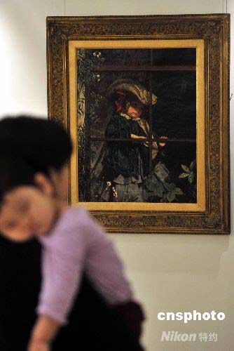 倫敦蘇富比將于年底舉行英國藝術(shù)拍賣,并在拍賣前于世界各地舉行巡回展覽。七月十四日,香港蘇富比舉行拍賣傳媒預展。圖為《今天不能散步》(作者:蘇菲安迪信)估價約九百萬至一千二百萬港元。作品描繪小女孩整裝待發(fā),準備外出散步,卻見雨點灑在玻璃屏上;陽光雖親吻小孩的臉龐,卻不掩其若有所失之態(tài)。中新社發(fā) 譚達明 攝