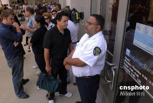 當?shù)貢r間7月14日上午,數(shù)百名儲戶在加州帕薩迪納市的“因迪美聯(lián)邦銀行”門口排隊等待提取現(xiàn)金。 受次貸危機影響,6月底以來,美國最大的抵押貸款商因迪美銀行(IndyMac Bank)遭客戶擠兌,在11天內(nèi)被客戶提走現(xiàn)金13億美元,本月11日,因流動性嚴重不足,該銀行被美國儲蓄管理局勒令關(guān)閉,并將其業(yè)務(wù)轉(zhuǎn)交至聯(lián)邦存款保險公司運營,該銀行成為美國次貸危機以來被關(guān)閉的最大抵押貸款商。被接管并更名后的“因迪美聯(lián)邦銀行”14日開始營業(yè),大批客戶仍擔心財產(chǎn)受損,一大早便排隊等待提現(xiàn)。中新社發(fā) 張煒 攝