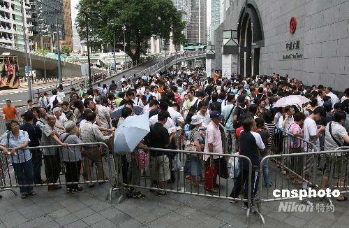 七月十五日,數(shù)千香港市民在中銀香港總部外等待領(lǐng)取奧運(yùn)紀(jì)念鈔票購(gòu)物憑證。三百七十六萬(wàn)張港幣奧運(yùn)紀(jì)念鈔票十六日才發(fā)售,但在開(kāi)售前的五十小時(shí),已有數(shù)以千計(jì)的市民前往中銀相關(guān)分行外排隊(duì)等候。中新社發(fā) 武仲林 攝