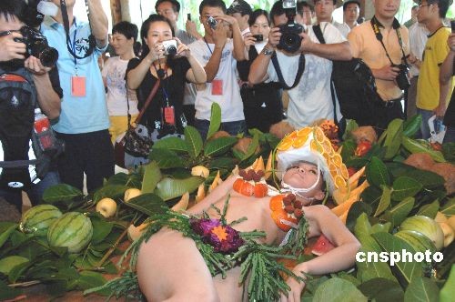 7月16日,廣東佛岡一度假森林舉行首屆“冰果狂歡節(jié)”,當天景區(qū)方面特別炮制了一場“水果人體秀”,檸檬、紅蘿卜、櫻桃、西瓜……全都變成了模特身上的衣物, 整個活動圍繞“清涼”主題,將清涼夏日演繹到了極致,令游客大為稱奇。中新社發(fā) 梁永強 攝