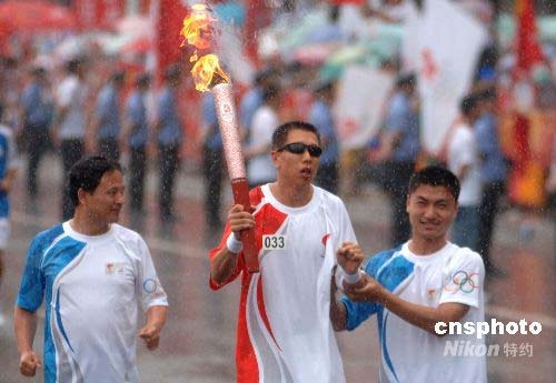 圖:雅典殘奧會冠軍吉林延吉冒雨傳遞奧運火炬