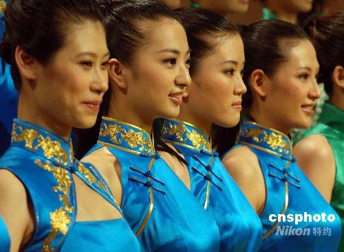 圖為志愿者展示寶藍(lán)系列頒獎(jiǎng)服。 中新社發(fā) 王東明 攝