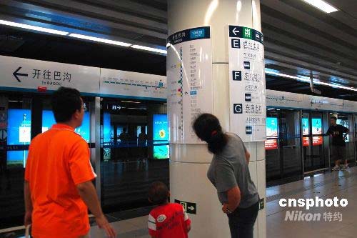 7月19日,北京軌道交通機(jī)場線、地鐵10號線(一期)、奧運(yùn)支線等三條線路試運(yùn)營開通。地鐵10號線是連接北京東部和北部的一條重要軌道線路,一期全長25公里。圖為在地鐵10號線芍藥居車站中,乘客觀察站牌。中新社發(fā) 張雙雙 攝