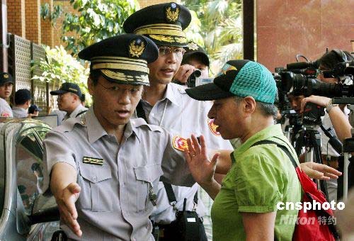 7月21日,臺(tái)灣前海軍中將雷學(xué)明等控告陳水扁等人誹謗案在臺(tái)北地方法院開(kāi)庭。這是是陳水扁卸任臺(tái)灣領(lǐng)導(dǎo)人后首度至法院出庭,創(chuàng)下卸任領(lǐng)導(dǎo)人以被告出庭的首例。為此,大批警方出動(dòng)維持秩序,不過(guò)仍發(fā)生陳水扁上午在步入法院時(shí)遭一民眾踹一腳的意外。圖為警方在法院門口勸離一民眾。中新社發(fā) 黃少華 攝