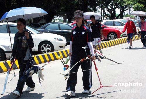 圖為中午,射箭運(yùn)動(dòng)員們正結(jié)束訓(xùn)練,返回休息。中新社發(fā) 黃少華 攝