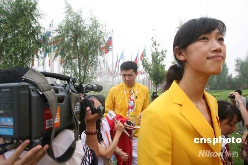 7月27日,北京奧運(yùn)會(huì)的運(yùn)動(dòng)員之家——奧運(yùn)村正式開(kāi)村,來(lái)自205個(gè)國(guó)家和地區(qū)的16000名運(yùn)動(dòng)員和隨隊(duì)官員將逐步入住。圖為王致郅接受記者采訪。中新社發(fā) 武仲林 攝