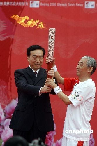 7月27日,河南省委副書記陳全國(guó)將火炬交于河南洛陽(yáng)第一棒火炬手張海(右)手中,張海是當(dāng)代中國(guó)書法掌門人。當(dāng)日,北京奧運(yùn)接力到河南省洛陽(yáng)市。中新社發(fā) 慎重 攝