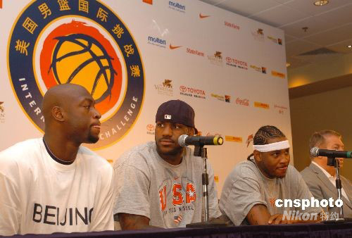 圖為七月二十八日抵達(dá)澳門的美國球員德懷恩·韋德(左一)、勒布朗·詹姆斯(左二)及卡梅隆·安東尼出席記者會(huì)。美國國家男籃隊(duì)將于七月三十一日及八月一日在澳門與土耳其及立陶宛隊(duì)進(jìn)行兩場(chǎng)奧運(yùn)熱身賽。中新社發(fā) 畢永光 攝