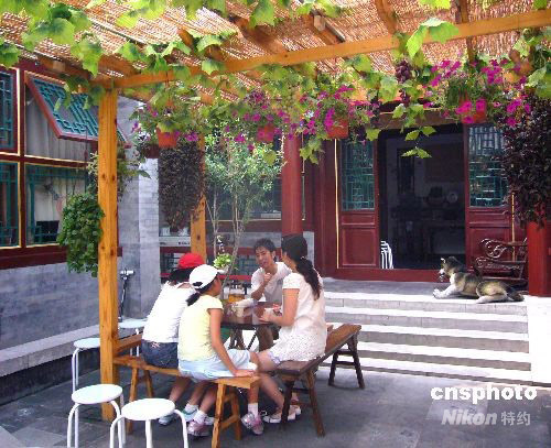 圖為首戶獲得“奧運人家”青花瓷盤標志的家庭——北京什剎海南官房胡同39號。 這座典型的北京民居,雕梁畫棟,整潔清新,院中的石榴樹和牡丹花透著勃勃生機,蟈蟈在竹籠里歡快地叫著。游客們圍坐在石桌前聆聽主人敘述這座四合院的來歷:“四合院由東、南、西、北四面的房間圍合而成,里面是一個中心庭院,已有兩千多年的歷史。古代,正房中間的椅子是專門給長輩坐的,因為父母是家里最受尊敬的人。父親坐在左邊,母親坐在右邊。”家庭講解員們不停地向前來參觀的國內外游客講述這座院落的歷史。 據介紹,自從被評為首個“奧運人家”以后,國內外各地的游客紛至沓來,前來參觀的游客人數驟增,于是親戚們便自發(fā)來幫忙,目前家里的工作人員有十幾人,其中有三個人的英語都是六級,奧運會期間,這三個人將會請假專職在四合院為來訪的奧運賓客服務!