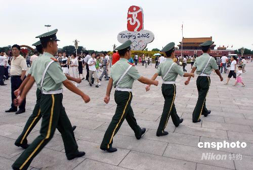 7月29日,一隊(duì)執(zhí)勤武警士兵從天安門(mén)廣場(chǎng)“中國(guó)印·舞動(dòng)的北京”主體花壇旁巡邏經(jīng)過(guò)。天安門(mén)廣場(chǎng)“奧運(yùn)”花壇整體工程進(jìn)入尾聲,奧運(yùn)氣氛更濃,市民與游客紛紛至此游玩拍照,安全保衛(wèi)工作也加強(qiáng),以確保“平安奧運(yùn)”。 中新社發(fā) 劉新 攝
