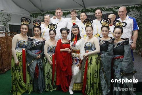 圖為英國跳水隊和奧運村茶館里的演員一起合影。 中新社發(fā) 杜洋 攝
