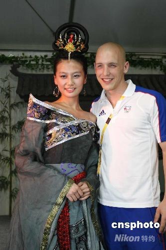 圖:英國(guó)運(yùn)動(dòng)員和身著古裝的中國(guó)美女合影