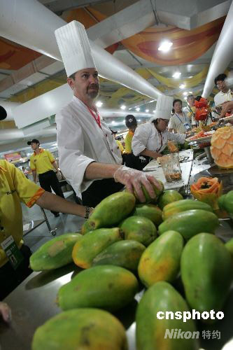 7月30日,北京奧運村的廚師在準備新鮮水果。中新社發(fā) 杜洋 攝