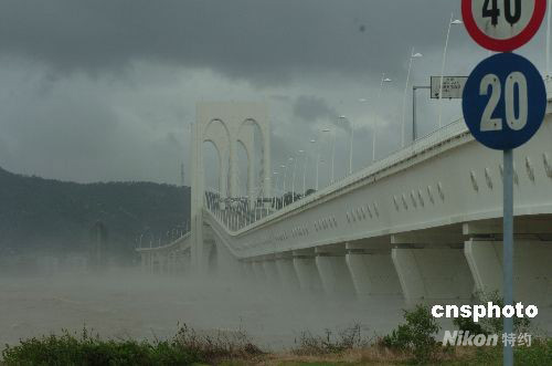 八月六日上午,受熱帶風(fēng)暴“北冕”影響,澳門(mén)掛出八號(hào)風(fēng)球,三座連接半島和離島的大橋橋面關(guān)閉,唯圖中西灣大橋的下層通道可供車輛使用。中新社發(fā) 畢永光 攝