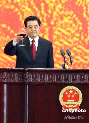 8月8日,中國(guó)國(guó)家主席胡錦濤在北京人民大會(huì)堂宴會(huì)廳為出席北京奧運(yùn)會(huì)的貴賓舉行歡迎宴會(huì)。圖為胡錦濤在歡迎宴會(huì)上祝酒。中新社發(fā) 廖文靜 攝