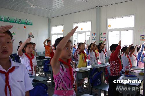 9月1日,四川省兩萬多所中小學(xué)新學(xué)期開學(xué),五十一個(gè)地震重災(zāi)縣的五千九百七十九所中小學(xué)校百分之百?gòu)?fù)課。圖為都江堰最大的板房學(xué)校皖川中心校的孩子們?cè)诮淌依锱e行升旗儀式。中新社發(fā) 黃永莉 攝