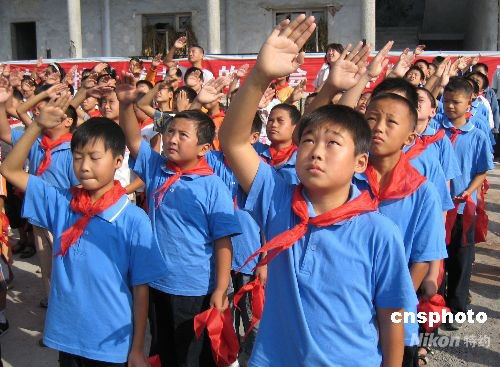 圖:開學(xué)第一天四川災(zāi)區(qū)學(xué)生舉行升旗儀式