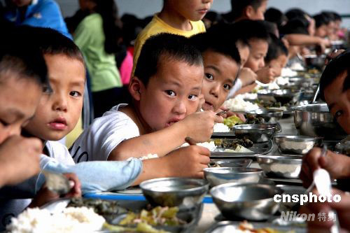 9月1日,四川阿壩州汶川地震災區(qū)的600余名學生在瀘州市第十中學校經(jīng)過兩周的環(huán)境適應后,正式進入過渡復課,圖為孩子們正在集體用餐,三菜一湯,吃得津津有味。中新社發(fā) 牟科 攝