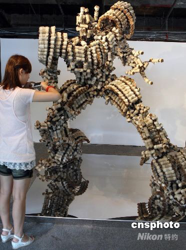 9月9日,上海雙年展國際學生展在創(chuàng)智天地拉開帷幕,國際學生展歷來是上海雙年展的主要藝術(shù)活動之一,本次展覽吸引了中外40余所一流設(shè)計院校前來參展。圖為一個由紡織廠廢棄物件組成的“變形金剛”吸引參觀者。中新社發(fā) 湯彥俊 攝