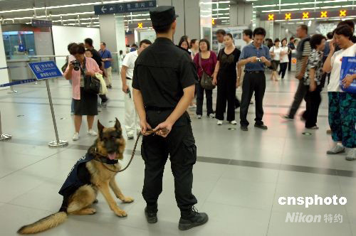 9月10日,北京2008年殘奧會正在進(jìn)行之中,北京市公安局公交總隊派出了公交警犬在10號線巡邏執(zhí)勤,檢查易燃易爆物品。圖為大批去奧林匹克公園看殘奧會和參觀的乘客駐足觀看執(zhí)勤的警員和公交警犬。中新社發(fā) 鄒憲 攝