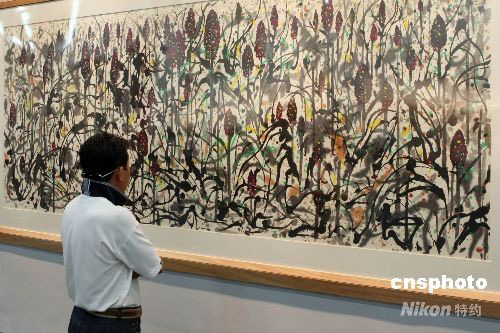 9月10日,2008上海藝術(shù)博覽會(huì)開(kāi)幕。本屆藝博會(huì)吸引了來(lái)自中國(guó)、美國(guó)、法國(guó)等20個(gè)國(guó)家的140余家優(yōu)秀畫廊前來(lái)參展。圖為吳冠中代表作《高粱》吸引參觀者。中新社發(fā) 湯彥俊 攝