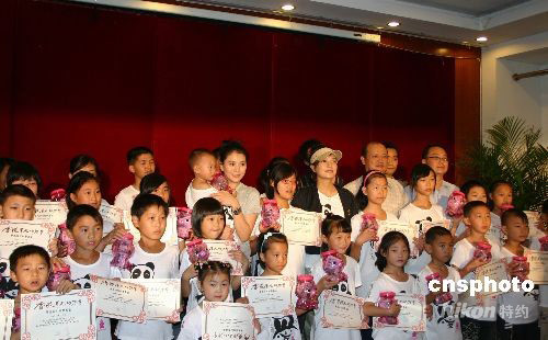 9月11日,香港華光功德會在綿陽成立“華光四川助學(xué)基金”,香港華光功德會的榮譽(yù)顧問袁詠儀、愛心大使趙薇與綿陽地震災(zāi)區(qū)學(xué)生合影。中新社發(fā) 霍潺 攝
